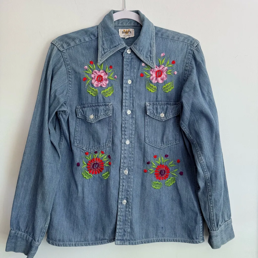 Unique 1970s/80s Natex hand-made embroidery on denim — original Mexican production - one of a kind! Measurements (flat, in inches): • Chest (pit to pit): 19” • Waist: 18” • Shoulders: 16” • Sleeve (shoulder seam to cuff): 24” • Length: (add measurement if you’d like me to include it) Details: • Label: Natex M.I.R. • Size tag: 303 CH (likely fits a Small) • Fabric: 100% algodón (cotton) • Made in Mexico • Medium-weight denim shirt with intricate multicolor embroidery front and back • Back design: vibrant symmetrical motif featuring hummingbirds, mushrooms, flowers, lips, and eyes in a folkloric, surreal arrangement • Front design: embroidered florals above and below both chest pockets • Button front closure, two flap chest pockets, and button cuffs • Classic pointed collar and Western-inspired seaming • Condition: Excellent vintage condition; fading at collar consistent with age (see photos). Laundered and ready for wear. Style Notes: Beautiful 1970s-inspired piece blending Mexican artisan embroidery with classic Western denim styling. Works perfectly as a lightweight jacket or overshirt. Statement piece for boho, festival, or folk-art fashion lovers.