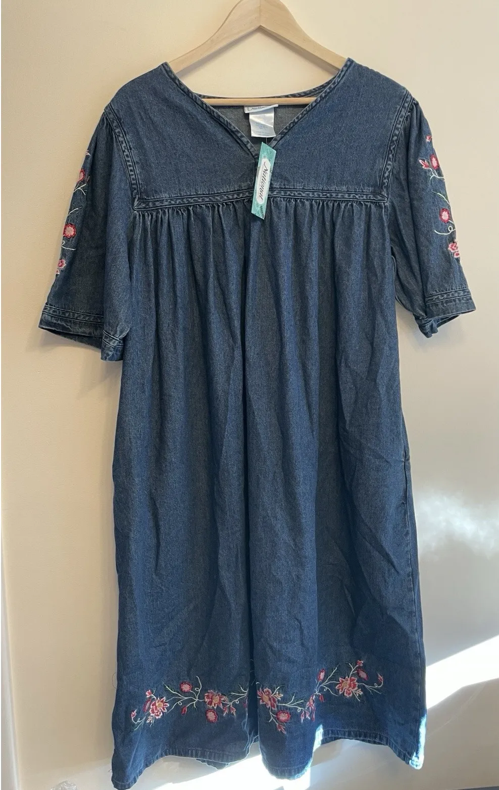 Vintage National Denim Muumuu Dress Women 1X Blue Embroidered Floral Cottage New - $43 New With Tags - From Poppy