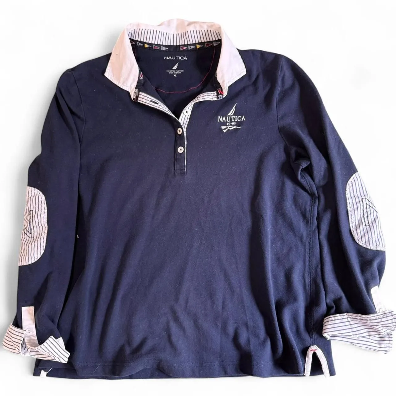 Vintage Nautica Navy Academia Preppy Long Sleeve Polo shirt with Elbow Patches Blue Size XL - $33 - From The Style