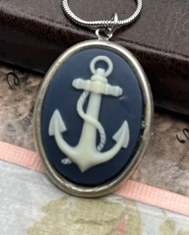 Timeless nautical style with a vintage flair. This pendant features a raised ivory anchor cameo on a rich navy background — newly paired with a durable stainless steel chain for everyday wear. Perfect coastal cowgirl accessory or gift for a sea lover. Details • Vintage anchor cameo pendant (1980s–90s era) • 20” stainless steel chain — hypoallergenic • Lobster clasp closure • Colors: Navy + Ivory • Style: nautical, coastal, cottagecore cowgirl trend • Condition: Excellent with minor vintage character Bundle to save — more nautical + vintage jewelry available! Style Tags: #CoastalCowgirl #Nautical #BeachStyle