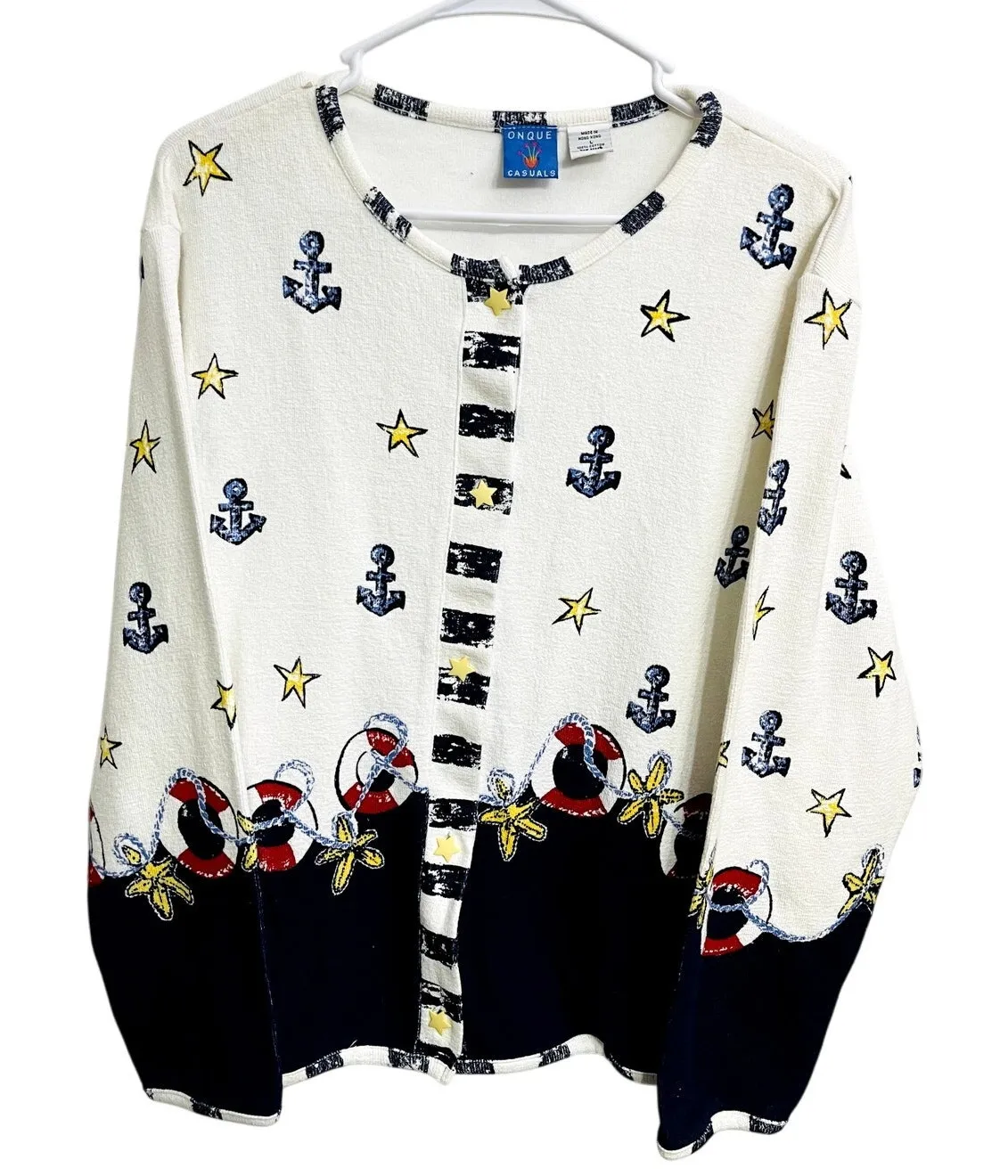All items are in pre-owned condition unless otherwise specified. Please reach out with any questions about the item. We ship quickly! Measurements: Pit to Pit - 22in Length - 26in Bottom part is dark navy not black Flaws: None Style: Coastal, nautical, beachy, boho, grandma sweater, artsy, art to wear