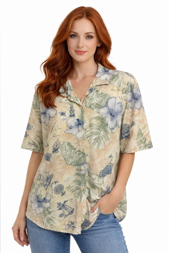under arm to under arm 23 so 46 around No size tag Shoulder to bottom 25 Vintage nautical-themed Hawaiian style shirt featuring a tropical floral and map-inspired print. Design includes palm leaves, hibiscus flowers, compass and nautical illustration details throughout. Classic button-up front with short sleeves and a relaxed, easy fit. Lightweight and comfortable, perfect for warm weather, vacations, resort wear, or coastal styling. A great statement piece for beach days, cruises, summer outings, or anyone drawn to vintage coastal and island aesthetics. vintage nautical nautical shirt hawaiian shirt tropical print floral shirt map print compass print coastal style island shirt resort wear vacation top button up shirt short sleeve shirt beachwear coastal grandma retro hawaiian summer shirt nautical aesthetic B11