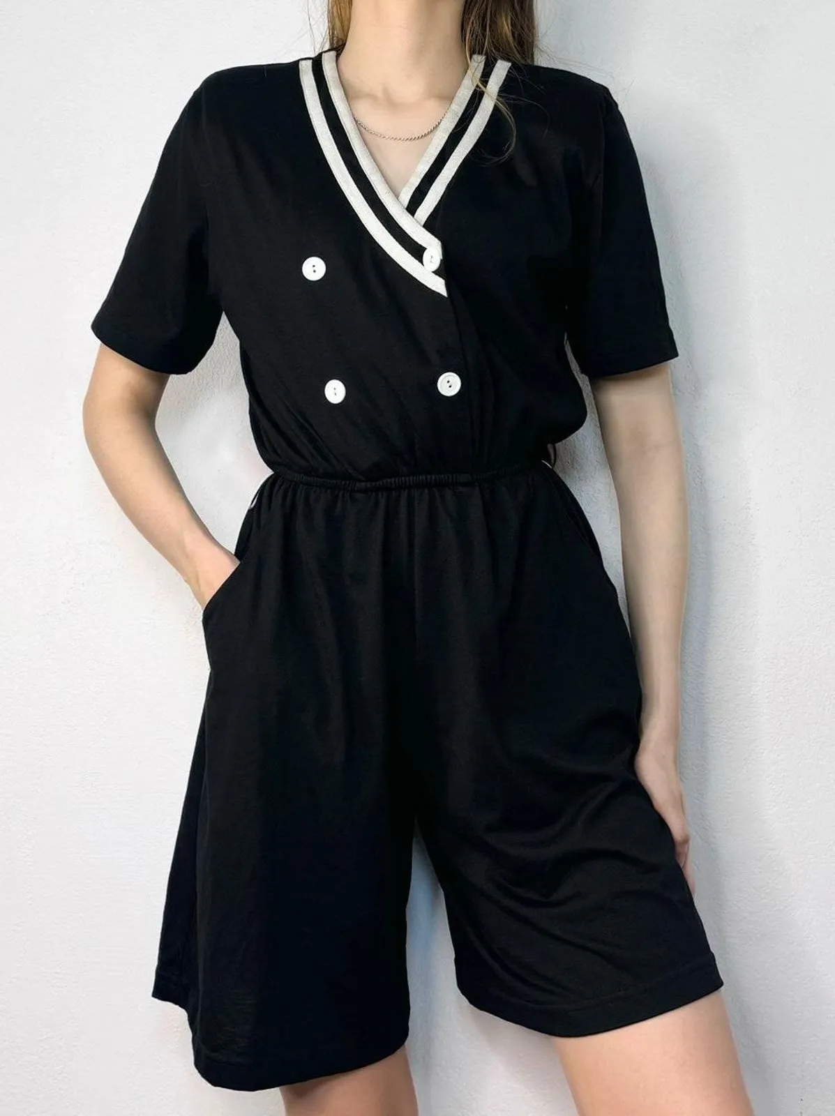 Vintage Nautical Romper Black and White Size Small 80s 90s Short Sleeve Elastic Waist, Good Condition missing belt Measurements (approximate); Laying Flat not Doubled Pit to Pit: 18 1/2” Waist: 10”-14” Top Length: 30” Inseam: 8 1/2” Double-breasted white button detail. Features a deep V neckline with contrast white striped trim nautical style, black and white, vintage romper, striped trim, elastic waistband, short sleeve, preppy aesthetic, 80s 90s fashion, summer outfit, retro vibe