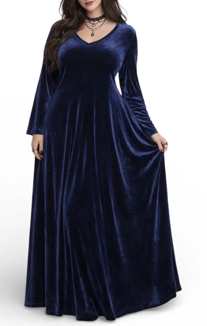 Dress.com Dress Vintage Plus Size 16W Navy Blue Stretch Velvet Maxi Dress V-neckline with long sleeves Soft A-line silhouette with subtle flare Pull-on style Made in the Dominican Republic 90% polyester, 10% spandex Flat lay measurements 21.5 inches pit to pit 21.5 inch waist 22 inch hips 50 inch length A deep navy velvet dress with a soft drape and moody whimsygoth energy