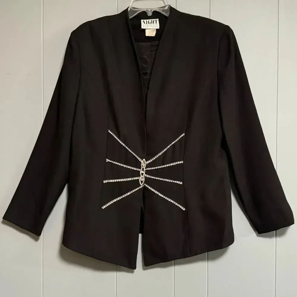 Women’s size 14 -Longer in the front, shorter in the back -Rhinestone starburst design on the front radiating from a center rhinestone clasp -Clasp has hooks that insert into eyes on the other side to close Measurements are taken flat and are approximate: Under arms across back - 22 inches Front length - 31 inches Back length - 27 inches Sleeves - 24 inches Good preowned condition; One loose rhinestone; one missing rhinestone (see photos) Open to reasonable offers!