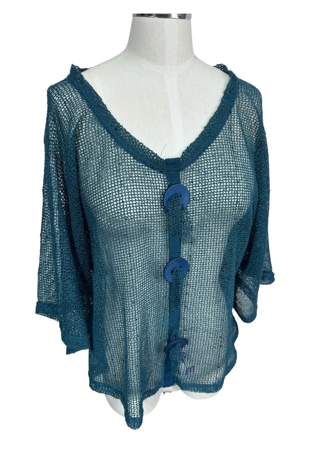 Vintage Noelle Blue Mesh Knit Fairycore Sequin Cardigan Artsy Boho Sheer Top OS Description: Vintage-inspired blue mesh knit cardigan by Noelle Enterprises. Features oversized statement buttons, a cropped boxy silhouette, and semi-sheer open weave perfect for layering. Made of a linen blend (42% linen, 38% polyester, 20% cotton). Tag reads one size. Approximate measurements: 21" chest, 21" length. GUC with minor wear from age. Ideal for a boho, beachy, or artsy look.