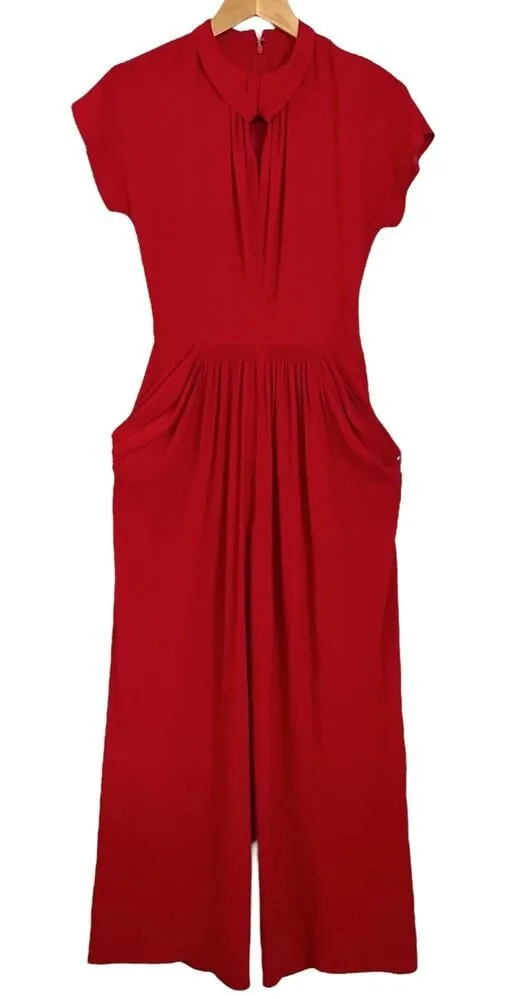 Stunning red archival jumpsuit with a cheongsam-style bodice from Norma Kamali for The Exclusive Collection for Bloomingdale's, circa 1980s. Red synthetic crepe body, likely rayon. Hidden back zipper with hook-and-eye closure. High neck with keyhole front and pleated details. Short cap sleeves. Cinched smocked waist, with no elastic and minimal stretch. Pleated pockets. Draping at hips leading into wide pant legs. Hits at or above ankle. Great vintage condition. No holes or stains. See all photos. (Last pic of similar 1980s Kamali jumpsuit in The Met Costume Institute collection.) Size Vintage 4 - fits XS/S Bust: 32" Waist: 25" Shoulder to waist: 18" Rise: 12" Inseam: 26" Length from shoulder to pant cuff: 54"