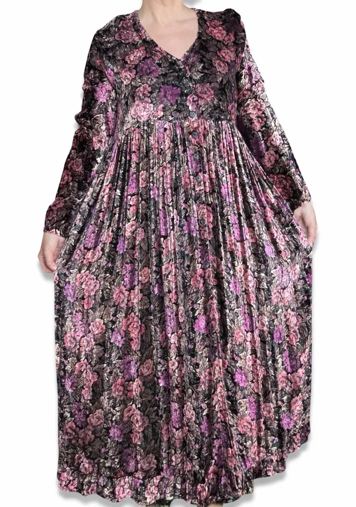Vintage 90s Nostalgia velvet maxi dress Medium Soft floral rayon velvet fabric with rich texture Black base with pink purple and mauve floral print Long sleeves with relaxed drape V neckline with button front bodice Empire waist with pleated skirt Full length maxi silhouette Made in India 100 percent rayon Flat Lay Measurements 20 inches pit to pit 18 inch waist 49 inch length Soft Whimsygoth stunner with a moody floral velvet drape blending gothic elegance and romantic nostalgia