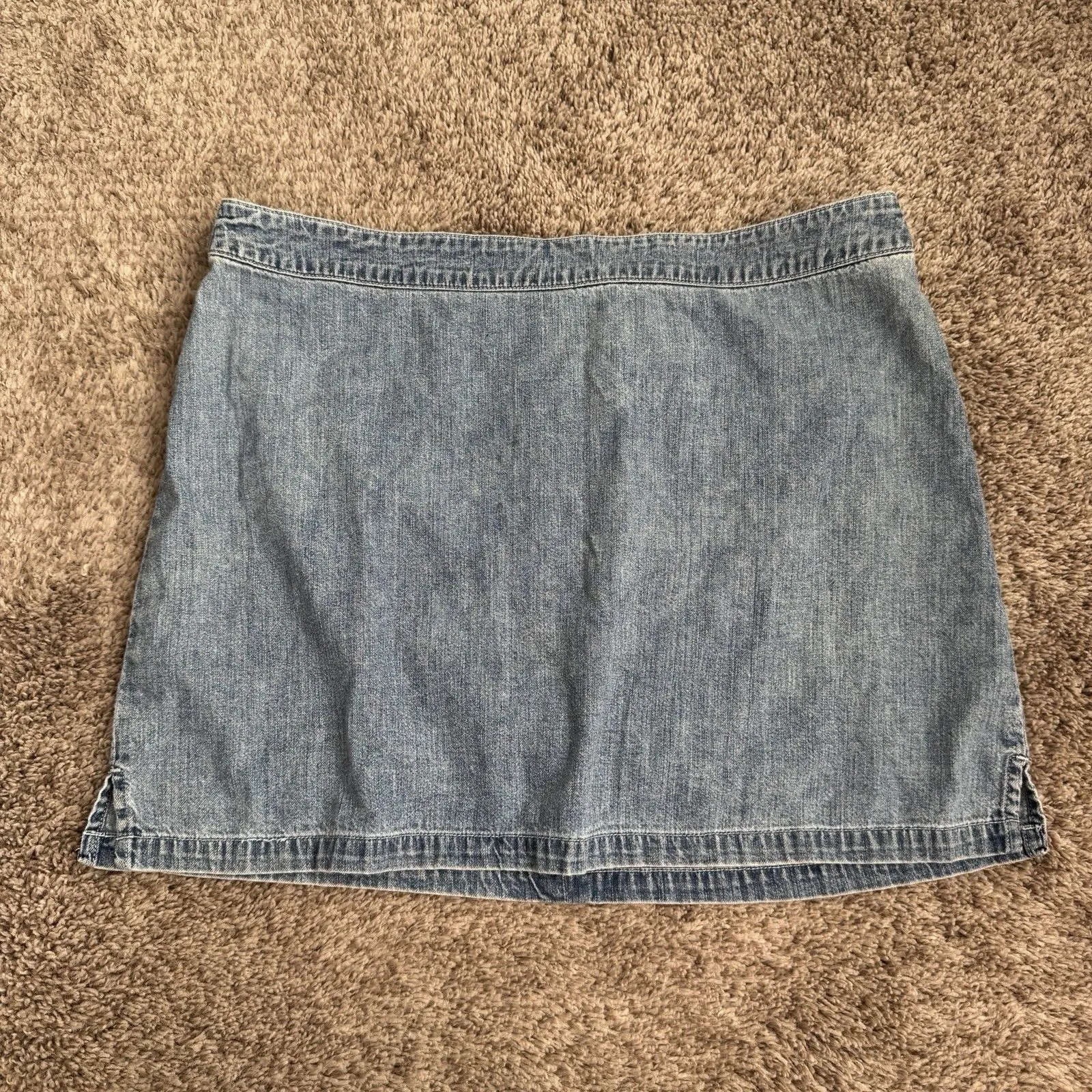 The product is a vintage Old Navy women's mini jean skirt in size 12, made of cotton denim in a blue... Show more