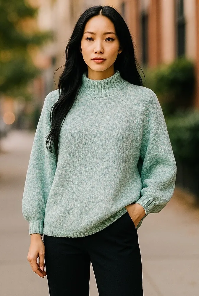Vintage One Step Up sweater Mint green and white color Popcorn knit Mock neck Drop shoulders long s... Show more
