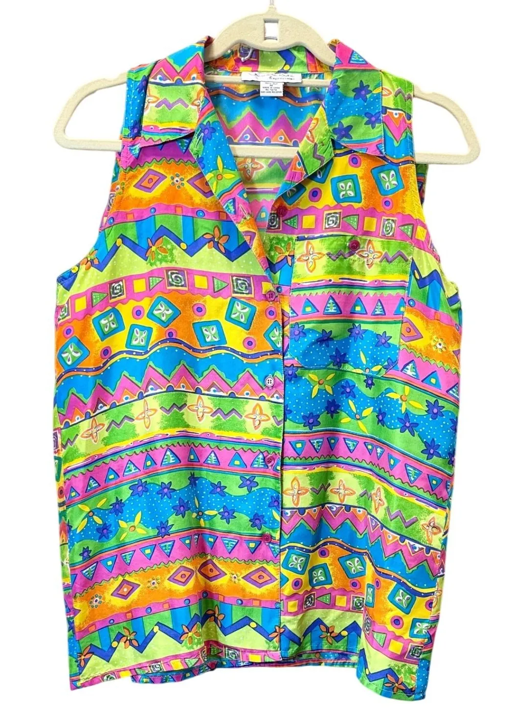 Eye-catching two-piece set featuring a vibrant and playful design. This set includes a sleeveless button-down shirt and matching shorts, both adorned with an array of geometric shapes, squiggles, and floral motifs in neon shades. The top has a point collar and a button-up closure, while the shorts showcase a comfortable elastic waistband. This eye-catching co-ord set is in a loud, fun print perfect for vacations or parties. Color: Multicolor Department: Women Set Includes: Shorts, Casual Shirt Number of Pieces: 2 Piece Material: 100% Polyester Season: Spring, Summer Fabric Type: Woven Character: Hippie, Skater Girl, Jill, Dorothy Occasion: Casual, Party/Cocktail, Travel Sleeve Length: Sleeveless Pattern: Geometric Type: Outfit/Set Keywords: vintage, retro, sleeveless shirt, shorts set, two piece set, bright colors, funky pattern, geometric print, floral print, neon colors, vacation wear, party outfit, 90s fashion, colorful outfit Item is preowned, effort has been made to ensure all flaws are displayed photos serve as additional description Sizing varies by manufacturer and time period, please see measurements.