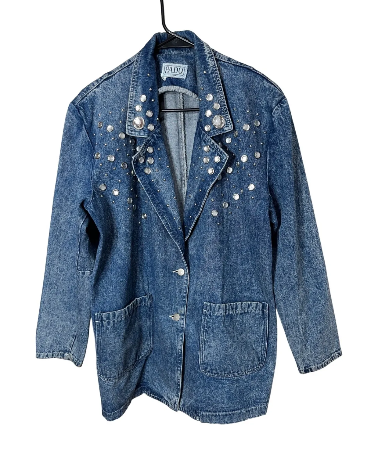 A striking denim blazer by PADO California, this women's jacket showcases a unique studded and rhinestone embellishment across the lapel and chest. The acid wash denim provides a classic yet edgy foundation for the sparkling accents. It features a traditional blazer silhouette with a two-button closure and two front flap pockets. The collar is adorned with prominent silver-toned studs and clear, faceted embellishments, creating a dazzling effect. Some staining along the collar Outer Shell Material: Denim Style: Basic Jacket Theme: 80s Accents: Studded, Rhinestone Fabric Type: Denim Season: All Closure: Button Occasion: Casual Keywords: Acid Wash, Vintage, Retro Fashion, Statement Jacket, Unique, 80s, oversized !!!Please See Measurements vintage sizes run smaller than modern sizes!!! Measurements Length:30 inches Pit to Pit:22 inches Arm Length:22 inches