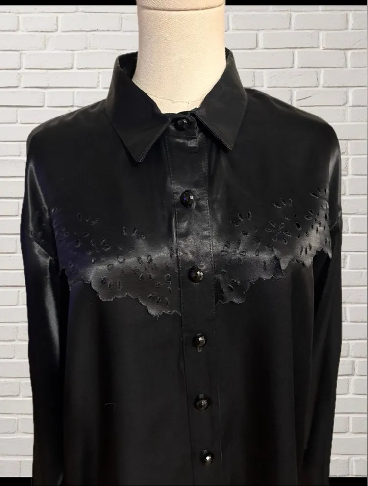 Vintage 1980s Panhandle Slim western shirt by Westmoor Mfg. Co., made in Fort Worth, Texas. Crafted from a soft black rayon-acetate blend with a glossy floral satin yoke and faceted buttons. Classic western styling with timeless rodeo elegance — perfect for country concerts, line dancing, or vintage western fashion lovers. pit to pit-23.5” shoulder to hem-29” • Size: Large • Fabric: 57% Rayon / 43% Acetate • Made in USA • Condition: Excellent Rodeo, western Fashion, Rodeo Glam, vintage western, shiny, satin, cowgirl, ladies western