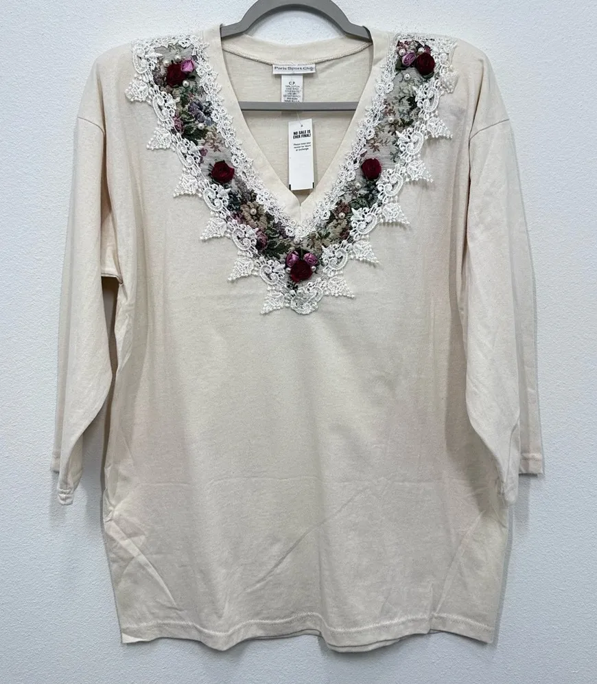 Vintage Paris Sport Club 90s Floral Rose Lace V Neck Tunic Cream NWT Feminine Brand New Deadstock i... Show more