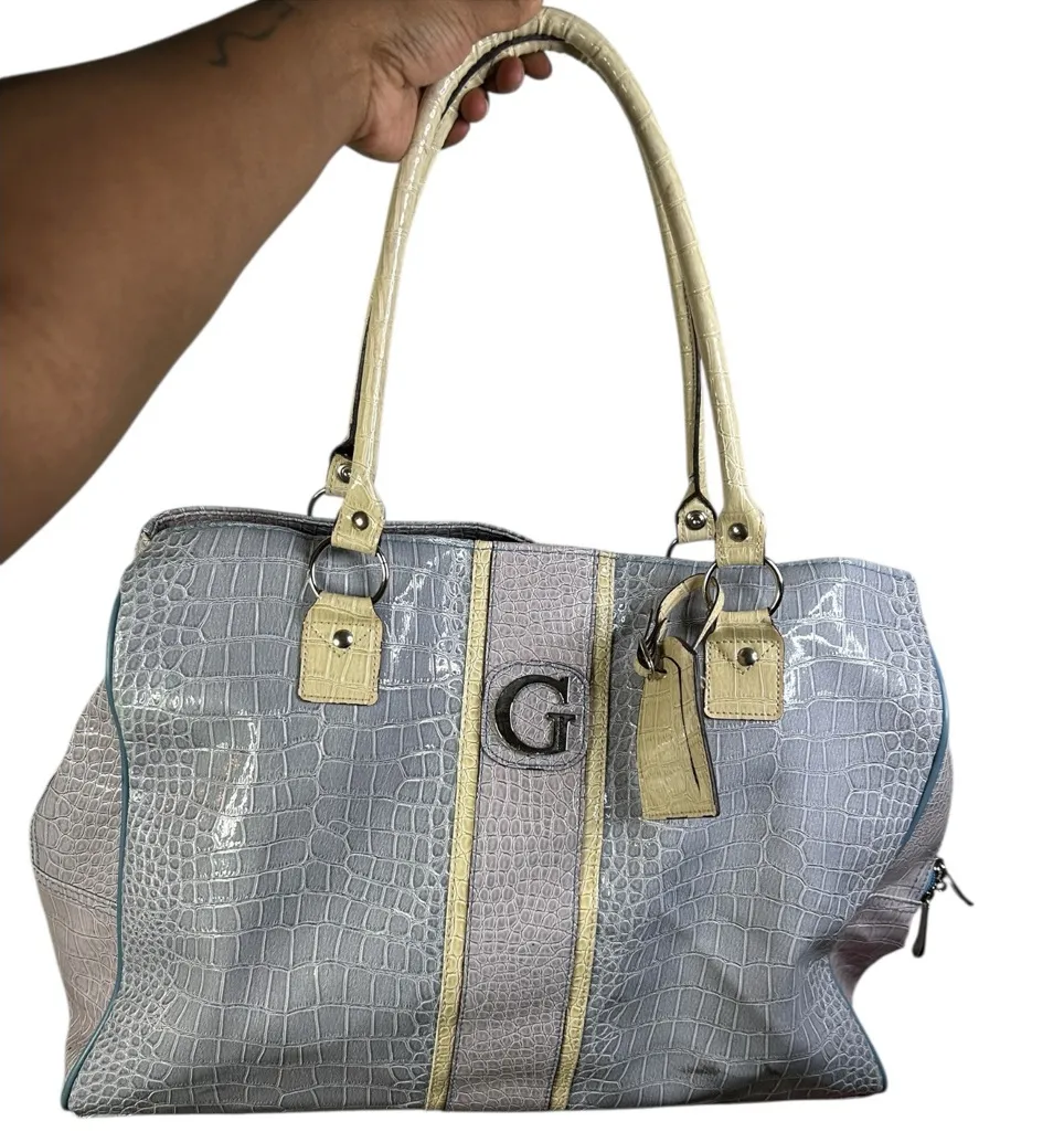 Y2K Coquette Glam Guess Croc Embossed Patent Satchel Tote Bag – Metallic Pastel Gray Beige with Ivor... Show more