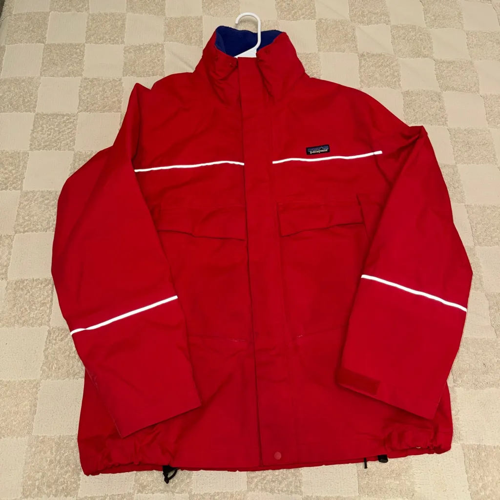 Bold red jacket with reflective accents. Ideal for outdoor activities. Durable and stylish design.
