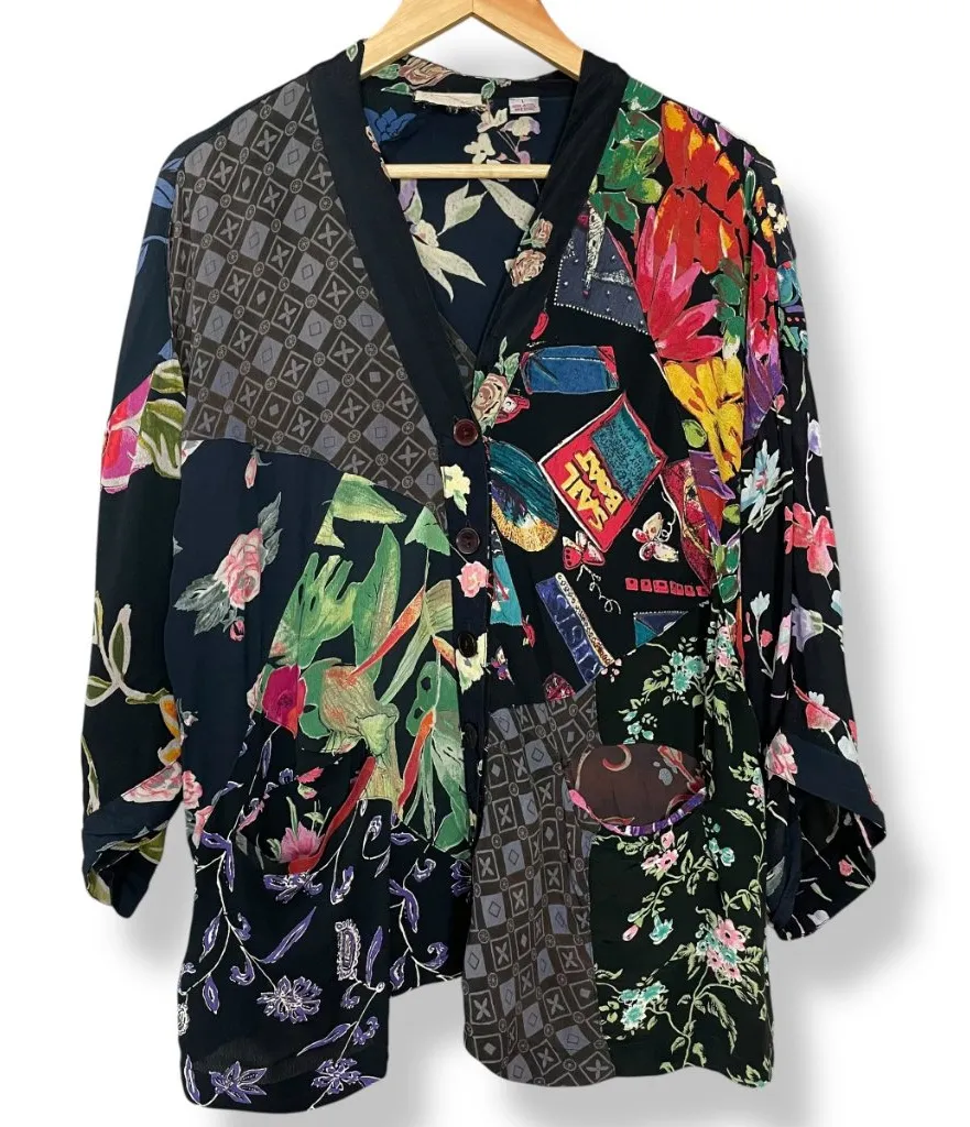 Vintage Nomads of the Desert women's rayon blouse in a patchwork style. Button-up front with V-neck.... Show more