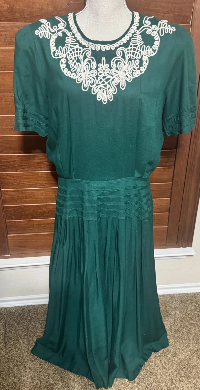 gently used condition -- no holes or stains Elegant and timeless vintage Plaza South women’s dress in a rich emerald green shade, featuring beautiful white soutache lace embroidery around the neckline. Designed with short sleeves, pleated skirt detail, and a flattering midi length, this dress offers a classic silhouette perfect for both formal and semi-formal occasions. * Brand: Plaza South * Size: Women’s 14 (see measurements) * Color: Emerald Green with White Soutache Lace * Style: Short Sleeve, Pleated Skirt, Midi Length * Fabric: 100% Rayon (lightweight, flowy) * Era: 1990s * Closure: Back zipper and buttons * Occasion: Cocktail, Church, Garden Party, Vintage Fashion Collectors A beautiful retro dress with timeless detail, perfect for those who love vintage feminine fashion. ----------------------------------------