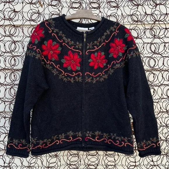 Vintage croft and borrow black gold metallic poinsettia embroidered zipper front holiday Christmas c... Show more