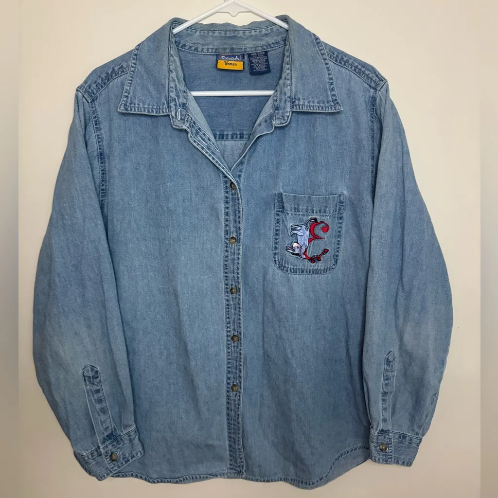 Vintage Pooh Women’s denim button-up shirt in size 18W/20W. Features soft medium-wash denim, classic... Show more