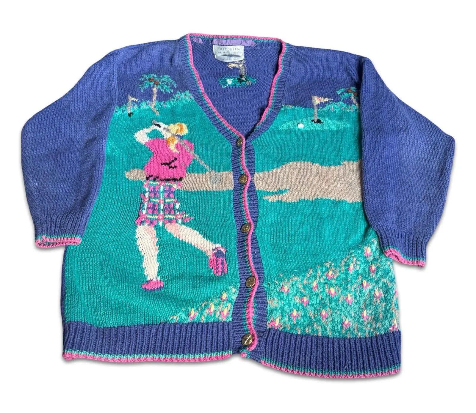 Rare hand knit vintage golf cardigan with a pastel novelty scene Portraits by Northern Isles cardigan Vintage novelty golf scene sweater Hand knit construction Button front closure V neckline Long sleeves Relaxed classic fit Blue teal pink and purple color palette Detailed golfer graphic front Mini golf green motif on back Collectible novelty golf buttons Design copyrighted Knitted by hand Discoloration and piling present Fits Modern Women’s XXL–3X Oversized fit depending on desired wear Flat Lay Measurements 29 inches pit to pit 29 inch length Statement vintage sweater Perfect for collectors maximalist style and art to wear lovers