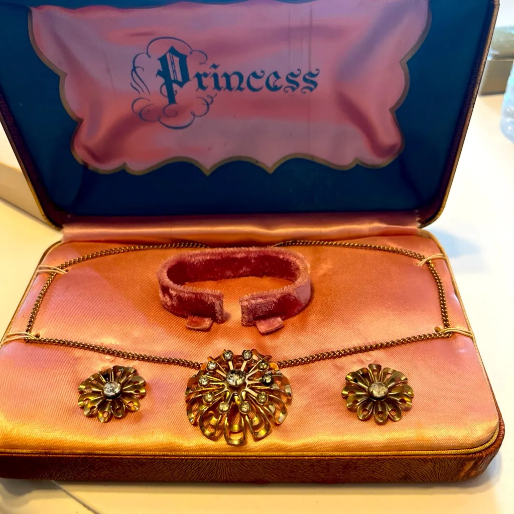 Elegant vintage jewelry set featuring a gold necklace 16 -18” that can also be worn as a pinned brooch and earrings adorned with rhinestones. Earrings are screw on back not pierced. Comes in a stylish case. Preowned
