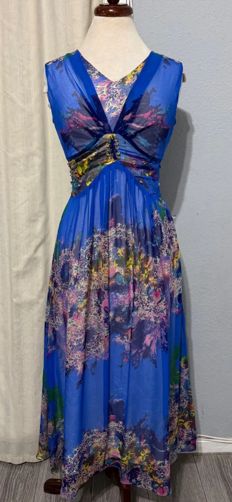 PRINCESS maxi dress featuring a vibrant blue hue with an artistic floral print. A deep V-neckline is elegantly gathered and adorned with sparkling blue and clear rhinestones, complemented by a ruched waistband embellished with matching stones. Preowned - Good condition Measurements: • Bust: 15.5 in • Waist: 13.5 in Style: Maxi, Fit & Flare Dress Length: Long Department: Women Sleeve Length: Sleeveless Pattern: Floral Occasion: Party/Cocktail, Casual, Formal Material: Polyester Fabric Type: Chiffon Theme: Flower, Colorful Neckline: V-Neck Season: Summer, Spring Closure: Zip Accents: Beaded, Rhinestone Keywords: maxi dress, floral print, rhinestone, embellished, V-neck, sleeveless, flowy, blue dress, party dress, cocktail dress, summer dress, evening gown, elegant