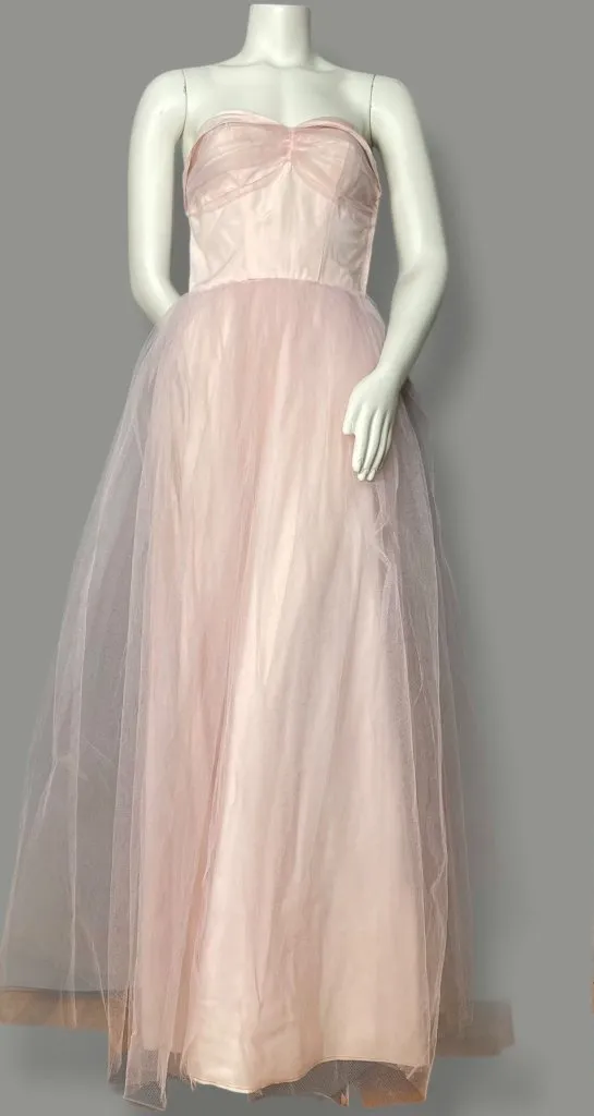 Vintage 50s pale pink tulle strapless dress with tulle overlay and zipper on the side. Currently a m... Show more