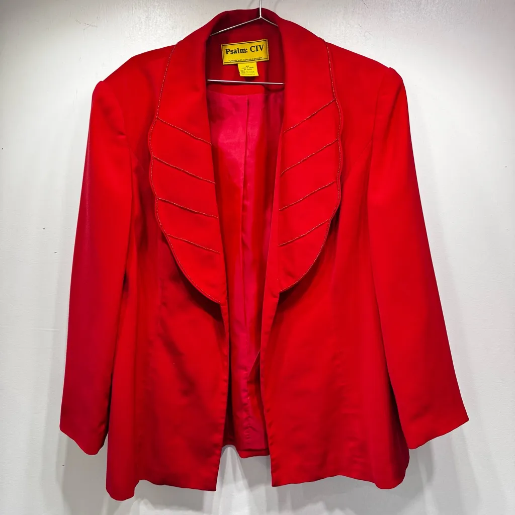 Vintage 90s Psalm CIV Red Blazer Jacket Beaded Statement Collar. “Clothed with light as a garment” Christian faith wear. Long sleeves. Lined. Women’s plus size 16W. Very good condition-missing front button, easy fix. All beads are in place and jacket condition is excellent. Clean, smoke free home and studio. Five star seller. Super fast shipping! Bundle 2+ items for 20% off! Measurements 23” armpit to armpit 28” length *measurements are approximate SKU# 251060 H31 Bible, Wear red for Charlie Kirk, church