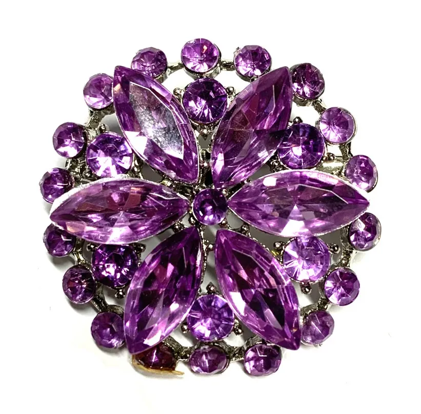 Add a pop of vibrant elegance to your outfit with this stunning vintage mid century era purple rhinestone brooch. Designed in a dazzling floral motif, this piece features marquise and round-cut amethyst-toned stones set in silver-tone metal. Ideal for adding flair to a jacket lapel, dress, or scarf. Secure pin back for easy wear. Excellent vintage condition. Perfect for collectors, special occasions, or gifting to vintage jewelry lovers. 1.5” wide x 1.5” tall