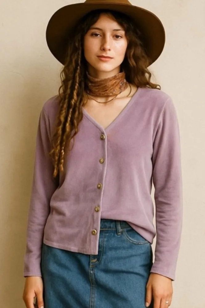 Vintage V neck button down sweater Full button Velour Very good condition Women small measures about 19” flat front buttoned Super cute and trendy for fall #fall #cozy #vintagesweaters #velour #cardigan