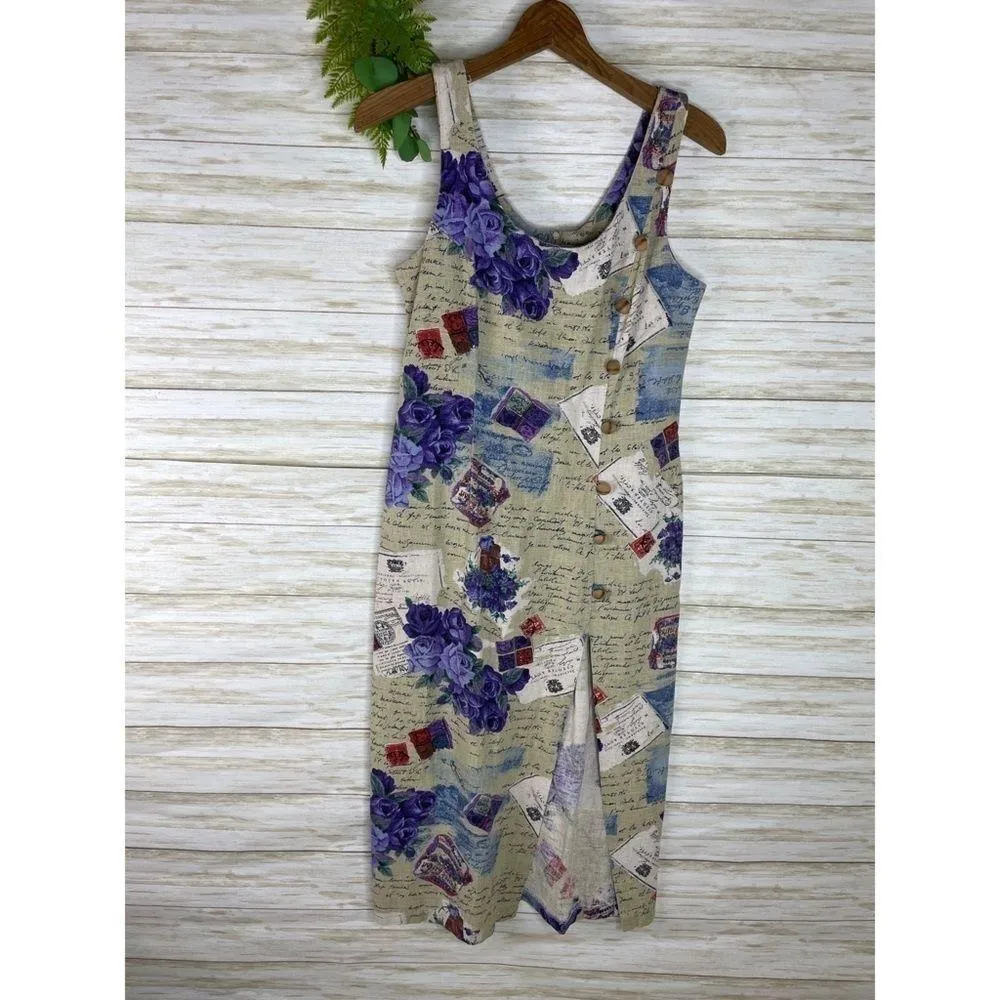 Blonde and Me Length: 46in shoulder seam to bottom Pit to pit: 17in flat across Waist: 15in flat across Previously loved, no holes or stains, but faded size tag as shown. Wooden faux button detail. Tags: adventure, whimsigoth, vintage, E