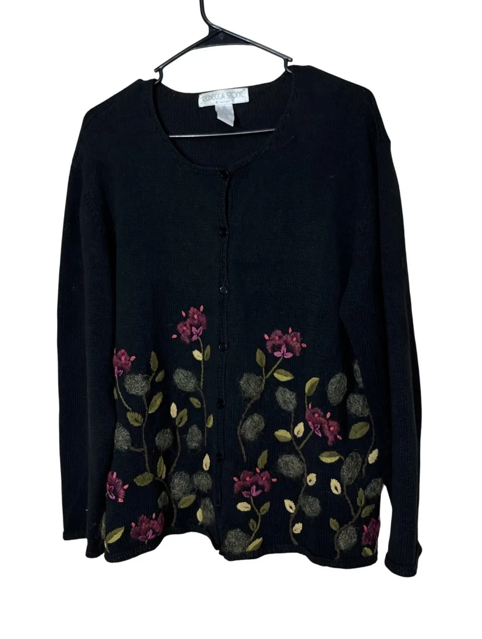 An elegant black cardigan featuring beautiful floral embroidery. This knitted cardigan boasts a round neck, button-down closure, and long sleeves, enhanced with a delicate floral pattern in shades of pink, green, and gold. The embroidery adds a touch of sophistication to this classic piece, making it suitable for both casual and more dressed-up occasions. Style: Cardigan Department: Women Material: Ramie, Cotton Sleeve Length: Long Sleeve Type: Sweater Neckline: Round Neck Features: Lightweight, All Seasons Pattern: Floral Fabric Type: Knit Accents: Button, Embroidered Keywords: Floral, Embroidered Sweater, Knit, Vintage, Classic, fall, winter !!!Please See Measurements vintage sizes run smaller than modern sizes!!! Measurements Length:26 inches Pit to Pit:23 inches Arm Length:23 inches