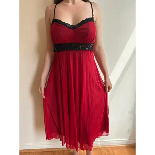 Darling red midi dress with a sweetheart bodice framed with black lace trim. Perfect for Christmas. Can be formal or casual depending on how you style it! Best fits a size medium, model is 5'7 32D 26" waist. Minor flaws on the trim. Message me with questions! #slip #gown #lace #90s #y2k