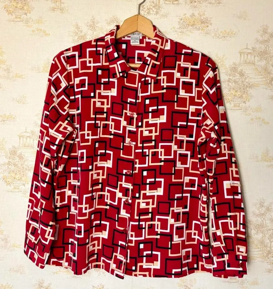 Vintage red black white mod square print long sleeve button front collared top M Size M - $20 - From Mallory