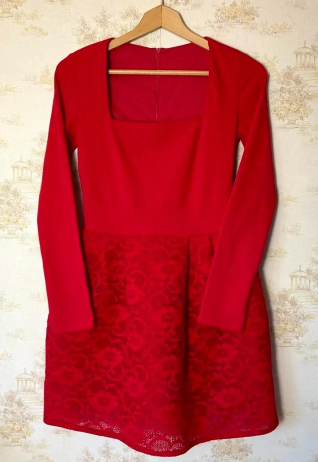 Vintage red long sleeve square neck fit and flare floral lace overlay mini party dress No size tag... Show more