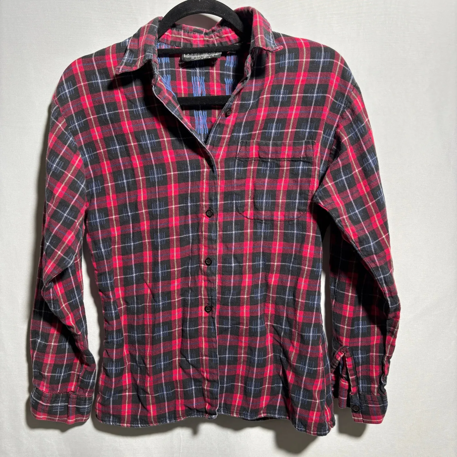 Classic flannel shirt featuring a timeless plaid pattern. This button-down shirt offers a soft and comfortable feel, making it a perfect layering piece or a standalone top. The design incorporates a traditional collar, long sleeves with buttoned cuffs, and a chest pocket for added functionality. The overall aesthetic balances casual comfort with a touch of rugged style, ideal for outdoor adventures or cozy days indoors. Perfect for wearing on a casual fall day, at a bonfire, or while running errands around town. Keywords: flannel shirt, plaid shirt, womens shirt, button down shirt, long sleeve shirt, red flannel, black flannel, cotton shirt, casual shirt, fall shirt, winter shirt, cozy shirt, grunge fashion, vintage flannel Just Class made in India fall autumn preppy academia retro Some wear. Please see photos for details.