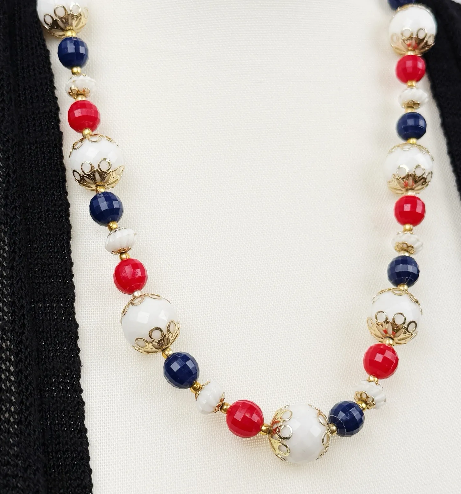 Charming vintage beaded necklace featuring glossy red, white, and navy blue beads accented with gold-tone filigree bead caps. The necklace closes with a push-box clasp marked "HONG KONG", indicating mid-century craftsmanship. A perfect piece for patriotic holidays, vintage jewelry collectors, or anyone who loves bold color combinations. We ship out same business day and are happy to answer your questions!