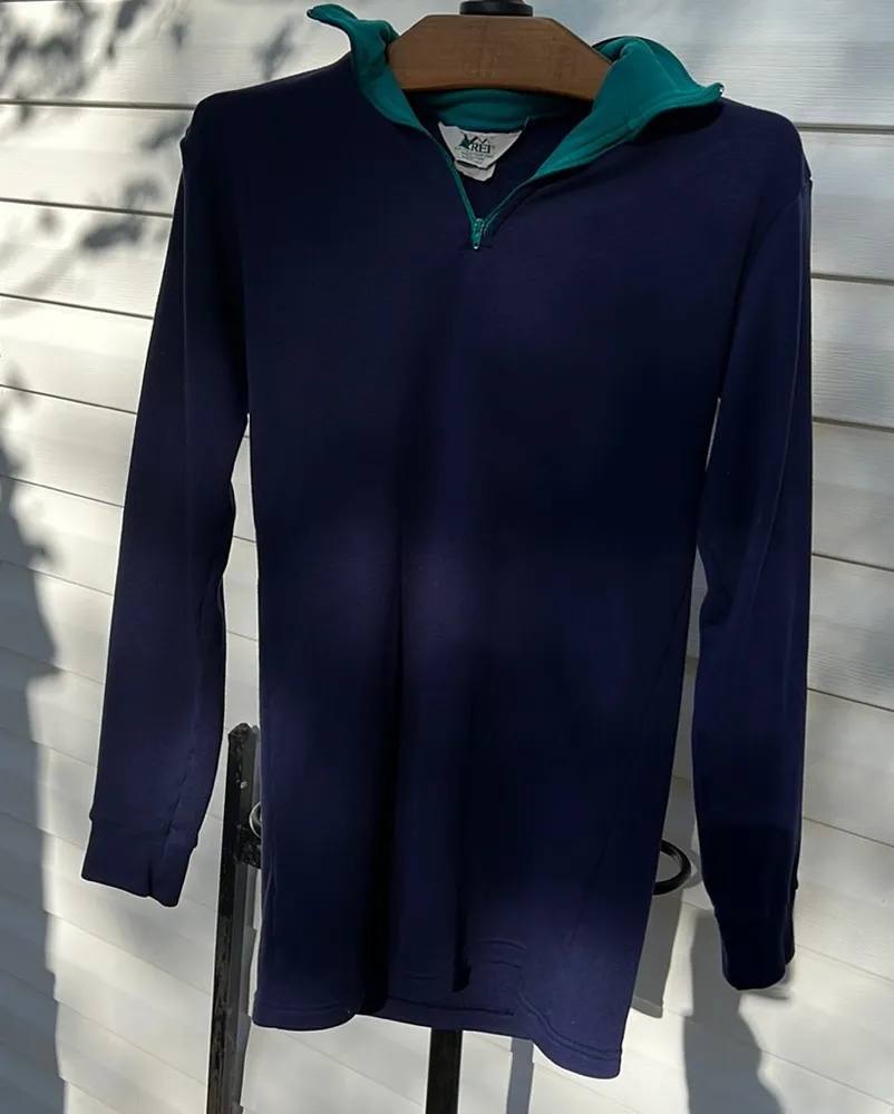 This awesome awesome vintage base layer from REI with really cool teal detail on the neck is an excellent preowned condition with no rips, holes, stains, or tears and perfect working zipper. Tag says men’s medium. Measurements - length from pit to bottom 21 inches arm length from pit to wrist 20 inches pit to pit 17 inches Heavy weight and 100% cotton