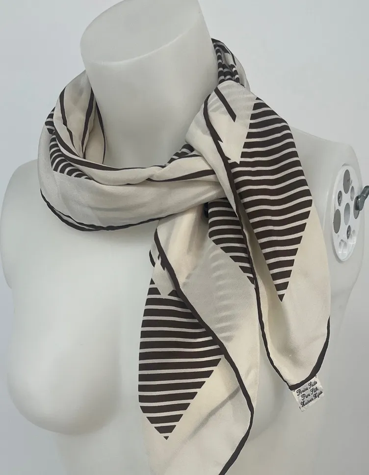 Elevate your style with this elegant striped scarf. Featuring a chic brown and cream design, it's perfect for any occasion. Gently preloved Approximately 29 x 29 Brown and Cream