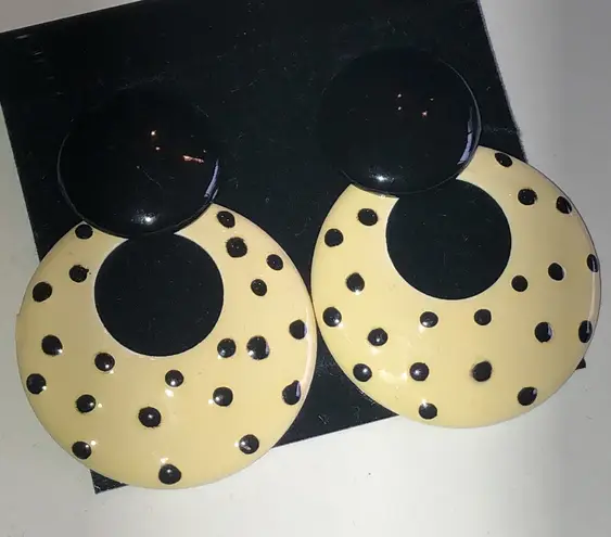 Bold earrings with black and cream polka dot design. Perfect for adding a playful touch to any outfit. New Approximately 2” x 2.5” A2 Boho Vintage Street Style Minimalist Statement Piece Essential Trendy Fashion Forward Must-Have On-Trend Cute Casual Edgy Classic Rare Find retro mid century modern estate jewelry costume jewelry