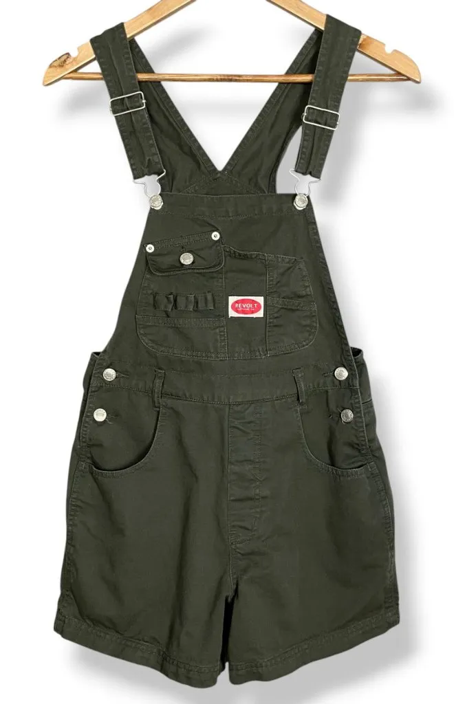 Vintage 1990s/Y2K Revolt Clothing Co women's shortalls in an army green color. Made in Hong Kong. Condition: Gently preloved, no holes or stains. Size: Juniors small. See approximate measurements for best fit. Across top of bib: 8" Across waist opening: 14.5" Full length: 30" (adjustable) Inseam: 4" Across leg opening: 12" Cleaned and from a smoke-free home. Fast shipper! shortall, retro
