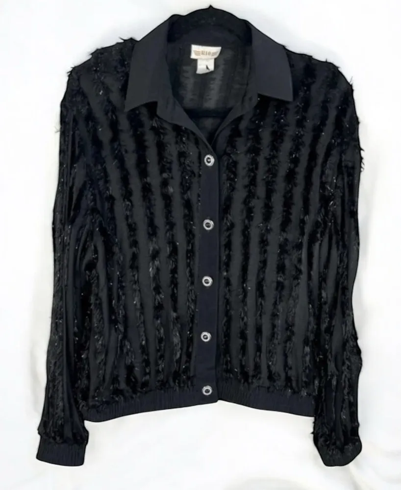 Excellent vintage condition No flaws Size Medium - please see measurements This jacket is anything but boring! Semi Sheer mesh jacket with feather accent fringe Elastic at hem and cuffs Shoulder pads that can easily be removed Rhinestone button front Made of acetate/lurex Dry clean Measurements approximately: Shoulder width 17.5” Sleeve length 24” Underarm to underarm 20” Total length from shoulder 20” Comes from a smoke free environment Ships out within 1 business day #Mod#Punk#Goth#Eclectic#Flare#Rave#Dark#Pride #Carnival
