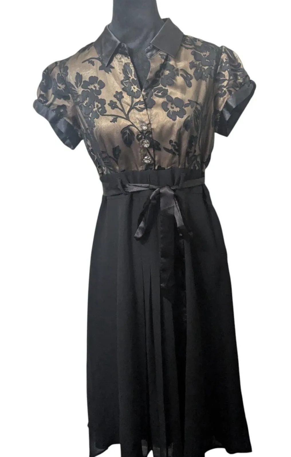 You know that feeling when you find a piece that doesn't just fit your body, but fits your soul? Feel the weight of the luxurious gold brocade and let your eyes linger on the velvet-flocked floral textures. This Robbie Bee original is more than a dress; it’s an invitation to be the most captivating person in the room. As you imagine yourself gliding through your next event, notice how the satin-tie waist perfectly defines your silhouette, giving you that effortless confidence you deserve. Whether you are leaning into a dark academia vibe or a modern Whimsigoth aesthetic, this dress is the missing piece you’ve been searching for. Own the mystery. Own the room. Buy it now and step into your new favorite memory.