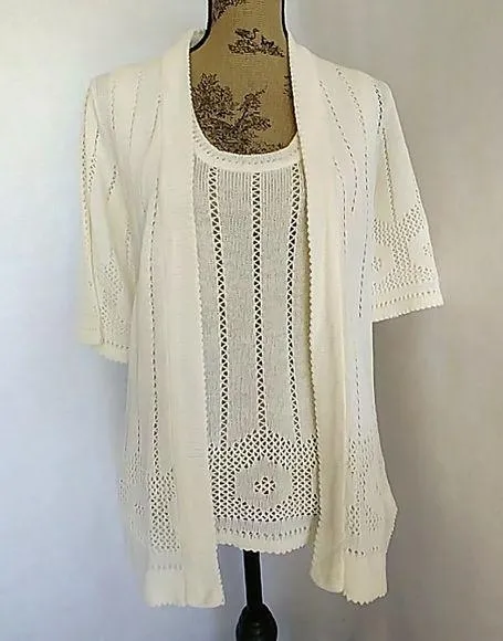 Women's 2pc Vintage sweater set Cardigan and tank Ivory in color By Rochelle Tank measures about 16" across chest About 26" in length Cardigan measures about 18" across chest About 28" in length Great preowned condition