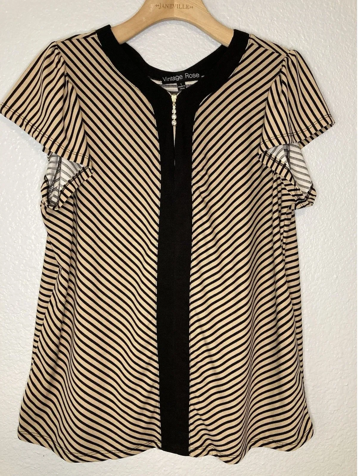 Vintage Rose Womens Top SS Blouse Striped 1/4 Zip Jeweled Gold Black Tan Tunic FAST SHIPPING Shoulder 14 in Pit to pit 20 in Sleeve 5 in Length 27 in Measurements are approximate lying flat. Ships same to next business day from smoke free home. Thank you for shopping small business. Please check out my other listings and give me a follow. Im always hunting treasures to bring back to life. Be blessed F