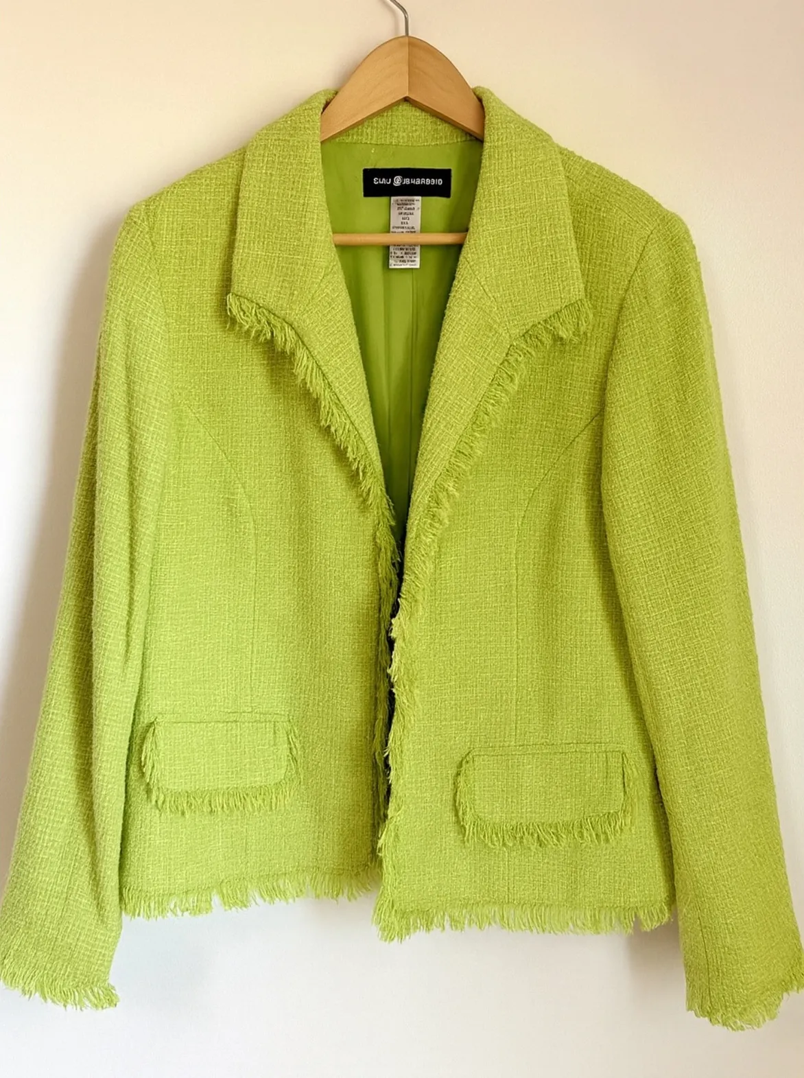Chic and stylish lime green tweed blazer by Sag Harbor. Features a fringed trim along the collar, he... Show more
