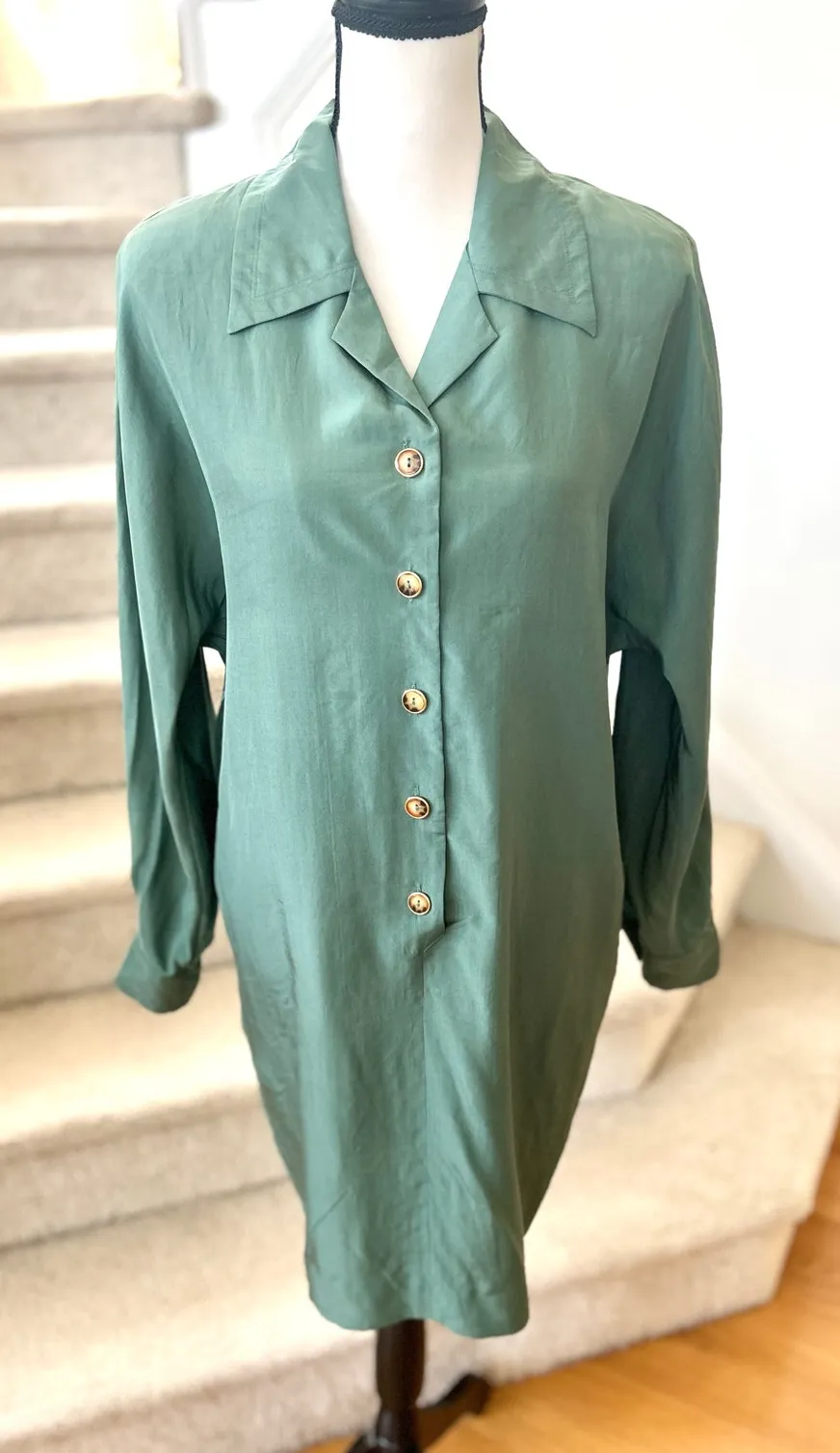 Very good condition, minor discoloration on one shoulder--it is hard to see in normal light as it blends into the fabric. I have not tried to spot remove it. Sage green, knee length, shift style shirt dress. Tortoiseshell buttons. Size 8 pit to pit 20 inches shoulder to hem 36 inches hips flat 20 inches Silk