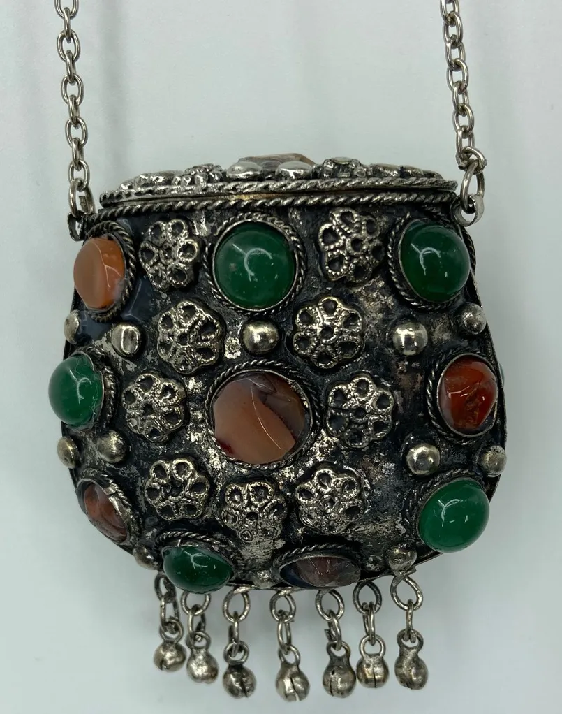 this silver necklace makes quite a statement encrusted semi precious stones (orange and green) Decorative silver Little jingle fringe hangs on the bottom And opens like a pouch to store little things. Silver chain is 30” long Container is approx 2.5 wide x 2” tall Lovely statement piece