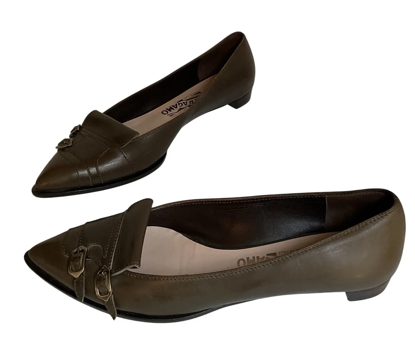 Vintage Salvatore Ferragamo Green Leather Loafers Pumps Women’s Size 8.5 Made in Italy / Zapatos Ferragamo Vintage Verdes Mujer Talla 8.5 Authentic vintage Salvatore Ferragamo women’s leather loafers pumps in a classic olive gree tone. Crafted in Italy, these elegant shoes feature a pointed toe, low block heel, and signature double buckle detail for a timeless and sophisticated look. High-quality leather construction with a sleek silhouette, perfect for workwear, office outfits, or elevated everyday wear. A true vintage designer piece with enduring style. Pre-owned vintage condition with visible wear consistent with age and use, including wear on soles and light creasing on leather (see photos for details). Structurally sound and wearable. ITEM DETAILS • Brand: Salvatore Ferragamo • Style: Loafers / Pumps • Color: Green (Olive Green) • Women’s Size: US 8.5 • Toe Shape: Pointed • Heel Type: Low block heel • Material: Leather upper & leather sole • Made in Italy • Closure: Slip-on • Era: Vintage Salvatore Ferragamo shoes, Ferragamo green loafers, Ferragamo vintage pumps, olive green leather shoes, Italian leather loafers, women designer shoes, luxury vintage shoes, made in Italy footwear, size 8.5 women shoes